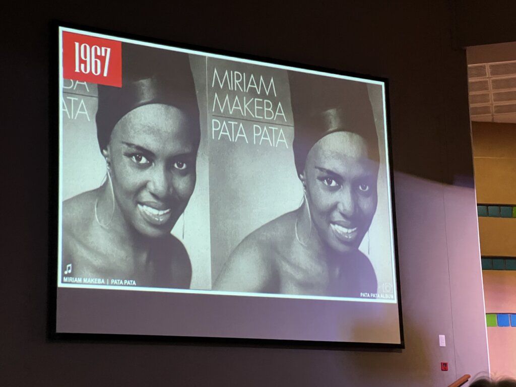 Michael’s presentation then carried us back through time. He traced the story of South Africa from around 1935 onward, connecting the lives and music of giants such as Miriam Makeba, Hugh Masekela, Jonas Gwangwa and Phuzekhemisi, among many others. I was fascinated to discover how interconnected these artists were across years, continents and movements.